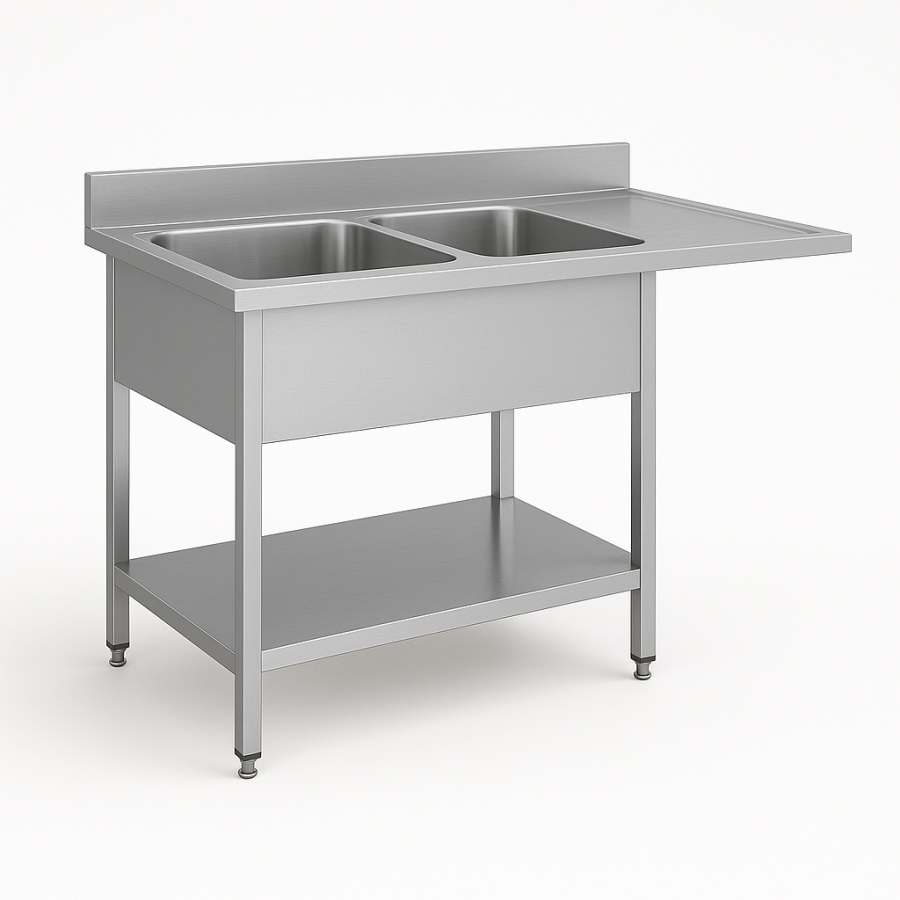 La plonge est entièrement conçue en acier inoxydable AISI 304. Ce matériau résiste aux chocs, à la chaleur et à l’humidité. Il répond parfaitement aux exigences d’hygiène des cuisines professionnelles. Les surfaces lisses empêchent la prolifération bactérienne. Vous nettoyez l’ensemble rapidement et sans effort, même après un usage intensif.