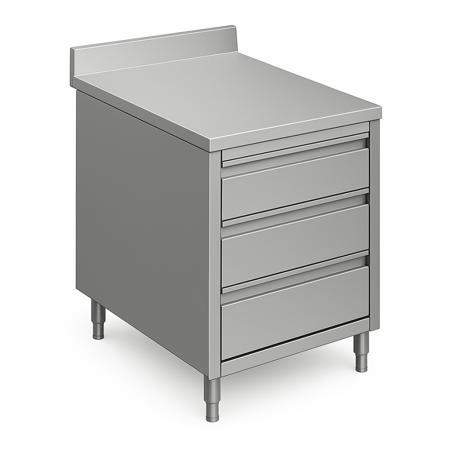 Placard inox avec plan de travail renforcé, trois tiroirs et dosseret pour une cuisine professionnelle fonctionnelle et hygiénique.