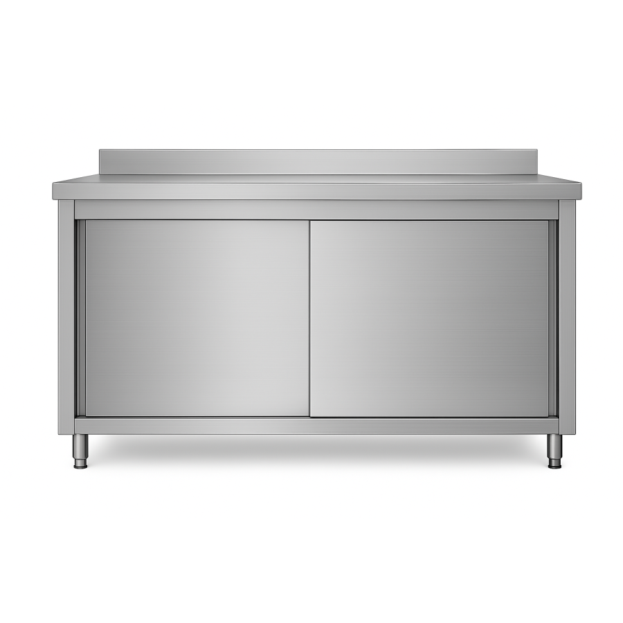 Placard avec plan de travail en acier inoxydable AISI 201, équipé d’étagère, portes coulissantes, pieds ajustables.