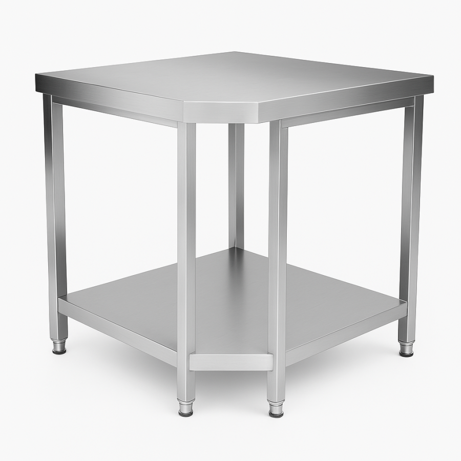 Table d’angle en inox AISI 201, renforcée, insonorisée et compacte, conçue pour optimiser l’espace de travail professionnel.